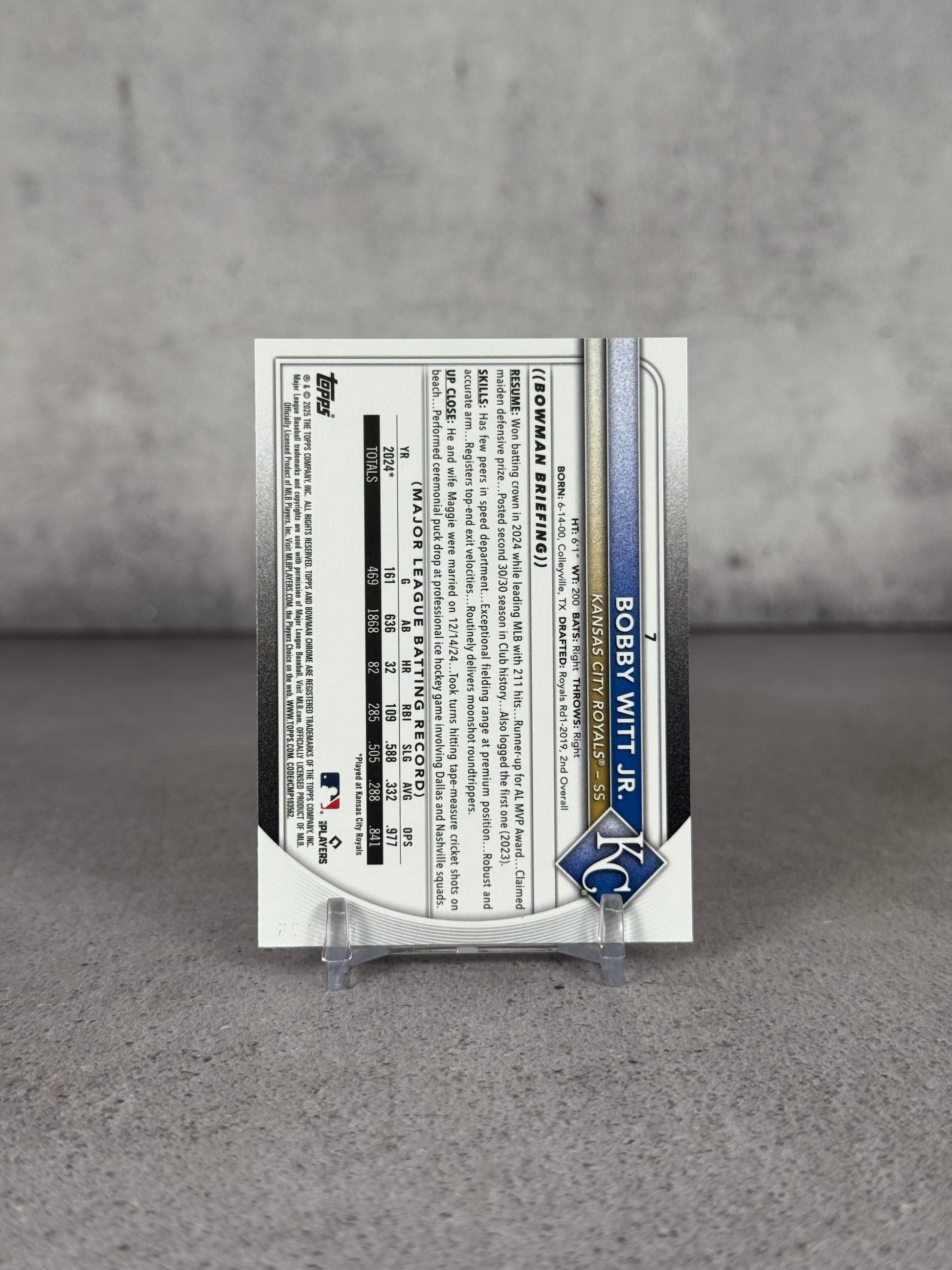 Tarjeta numerada 99/175 del jugador Bobby Witt Jr, uno de los talentos emergentes más importantes de MLB. Ideal para inversión deportiva.