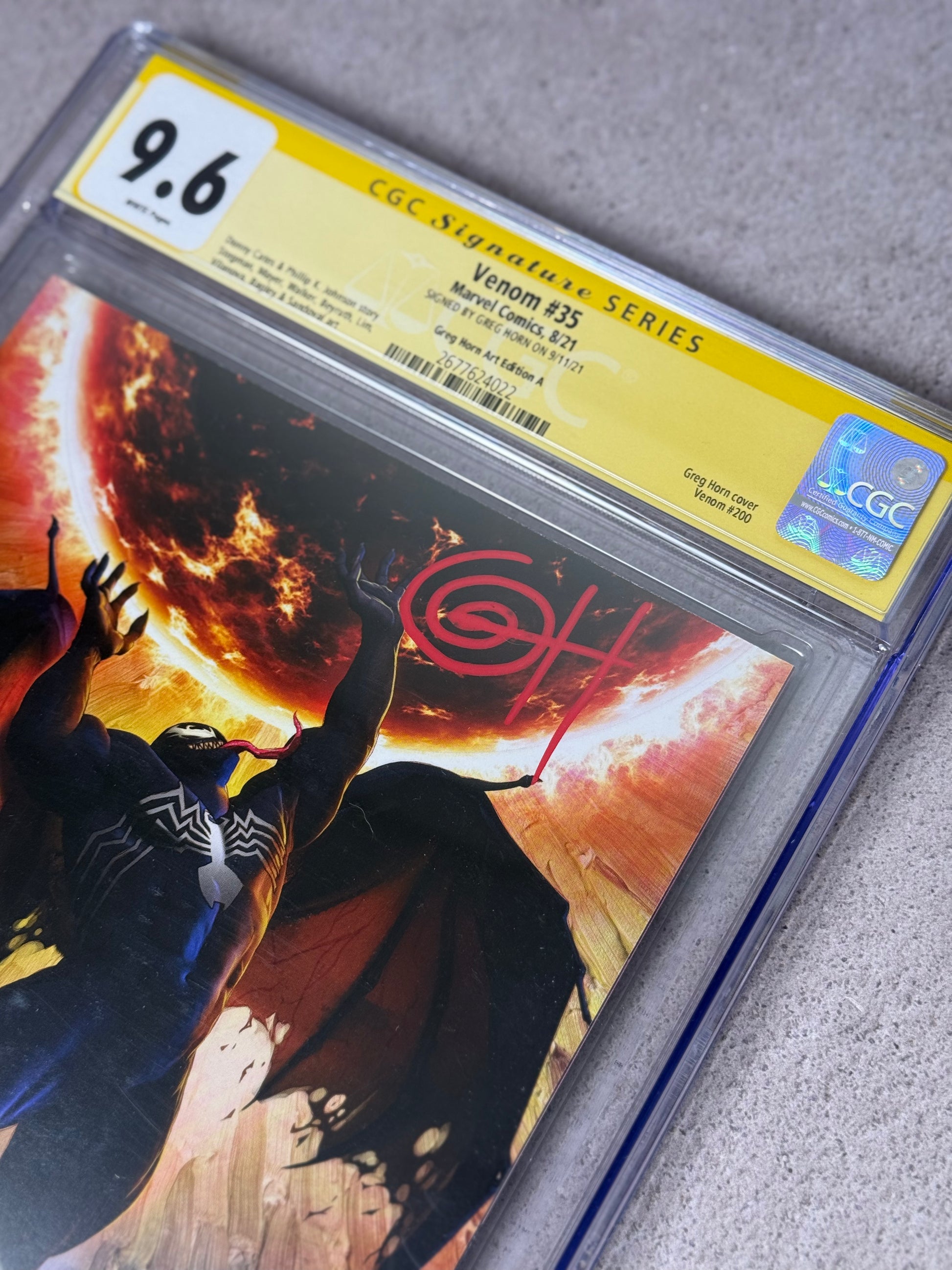 Comic Venom #35 en versión Greg Horn Variant, calificado CGC 9.6 y firmado por el artista Greg Horn, reconocido por su trabajo en portadas de cómic moderno.