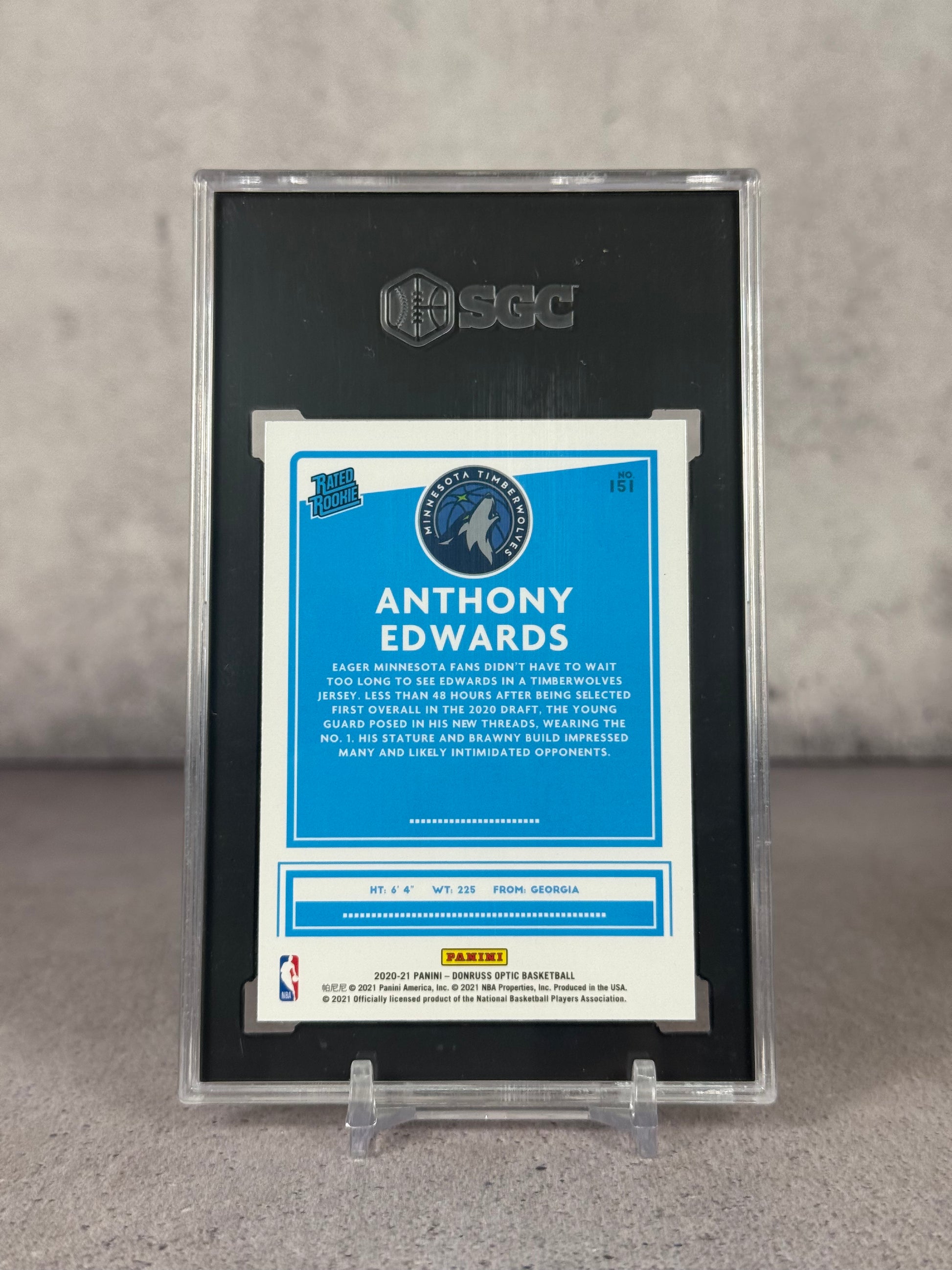 Tarjeta rookie Rated Rookie de Anthony Edwards del set Donruss Optic. Grado SGC 10 “Gem Mint”. Una de las cartas más buscadas del nuevo talento NBA.