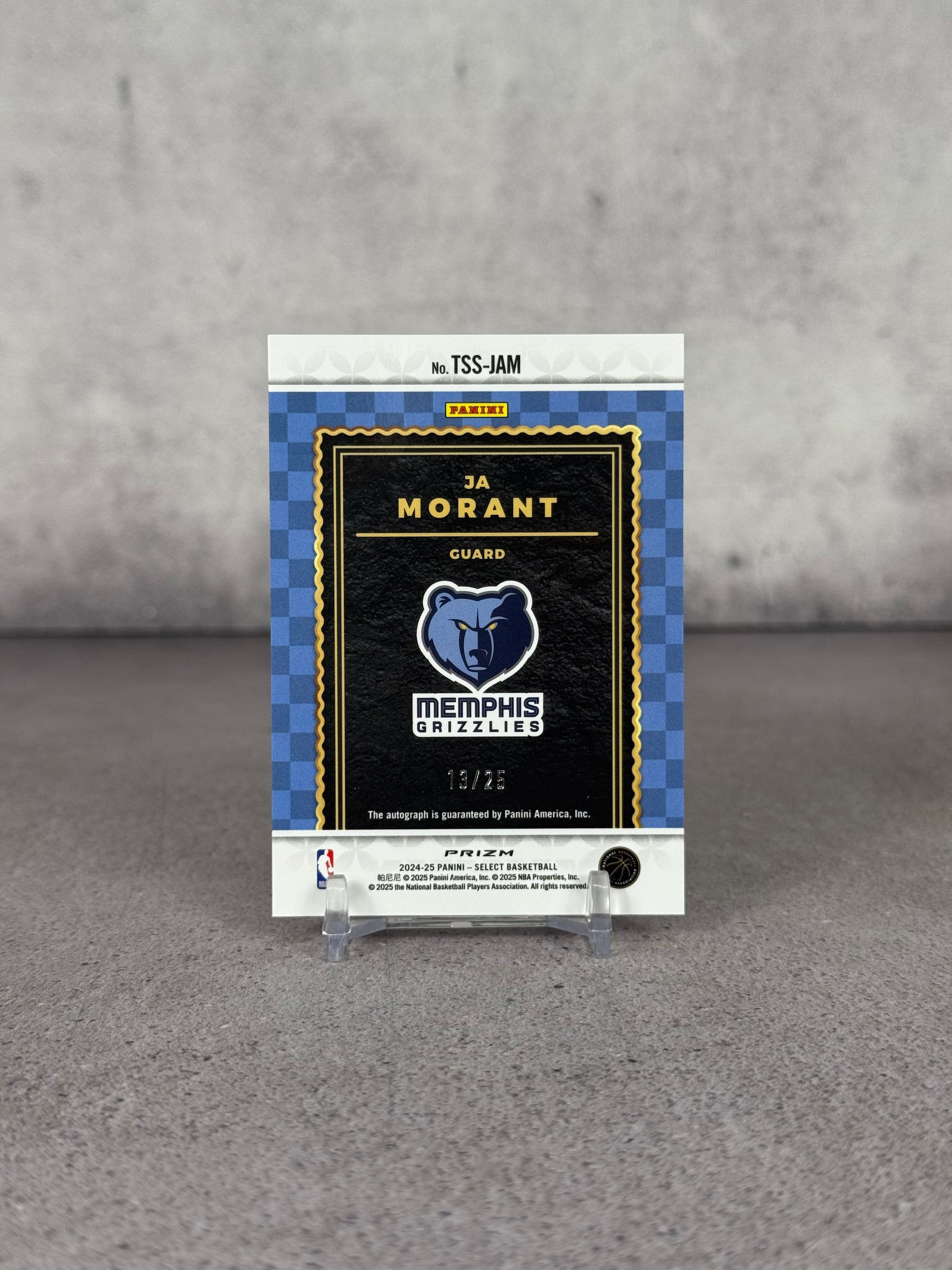 Tarjeta NBA Panini Prizm con autógrafo original de Ja Morant, numerada 13/25. Pieza extremadamente escasa y muy buscada en el mercado de tarjetas deportivas.