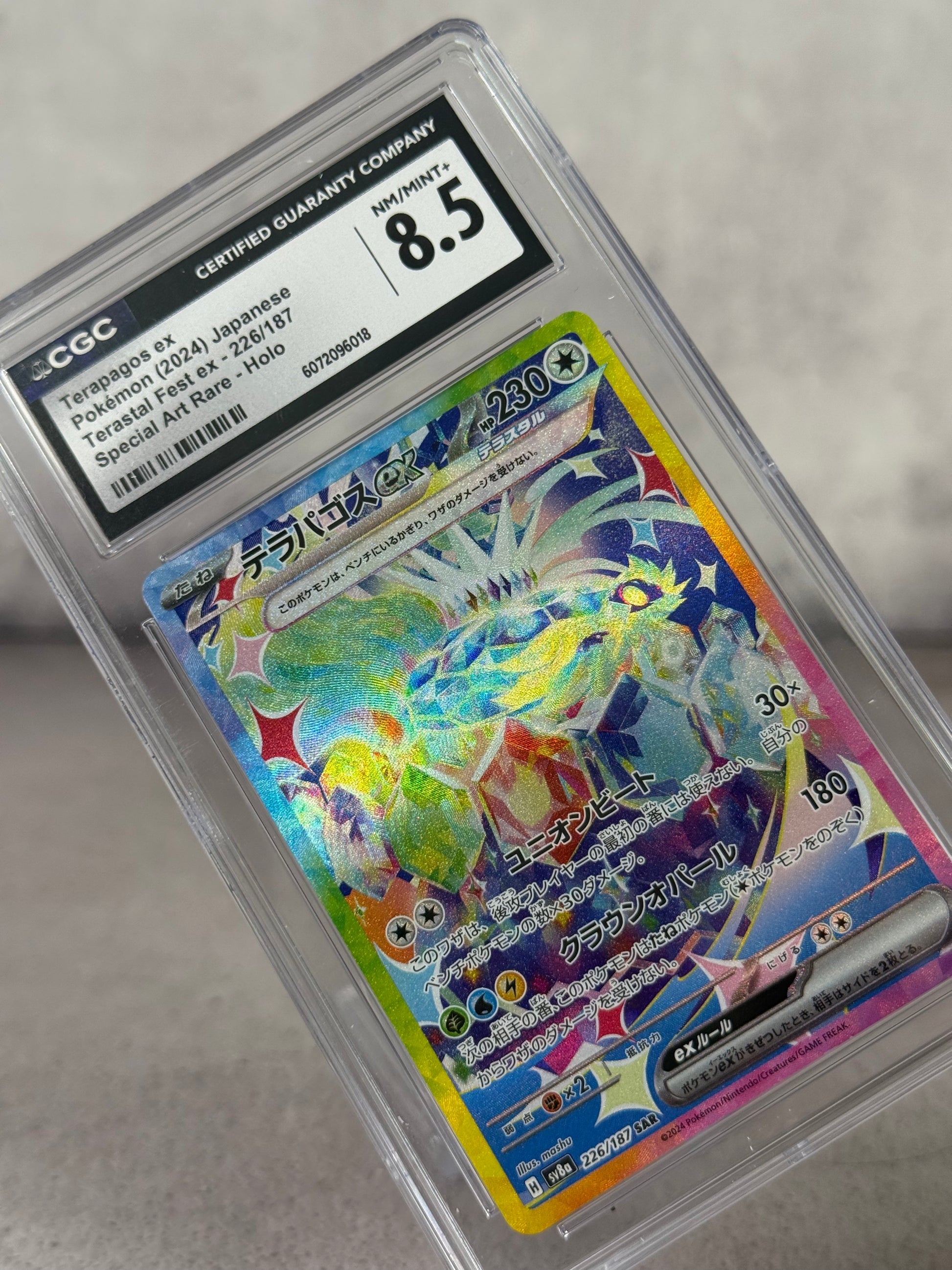 Tarjeta Terapagos ex en japonés del set Terastal Fest ex (2024), número 226/187 (Special Art Rare Holo). Certificada por CGC con calificación 8.5 (Near Mint+), pieza de arte especial dentro del set japonés.