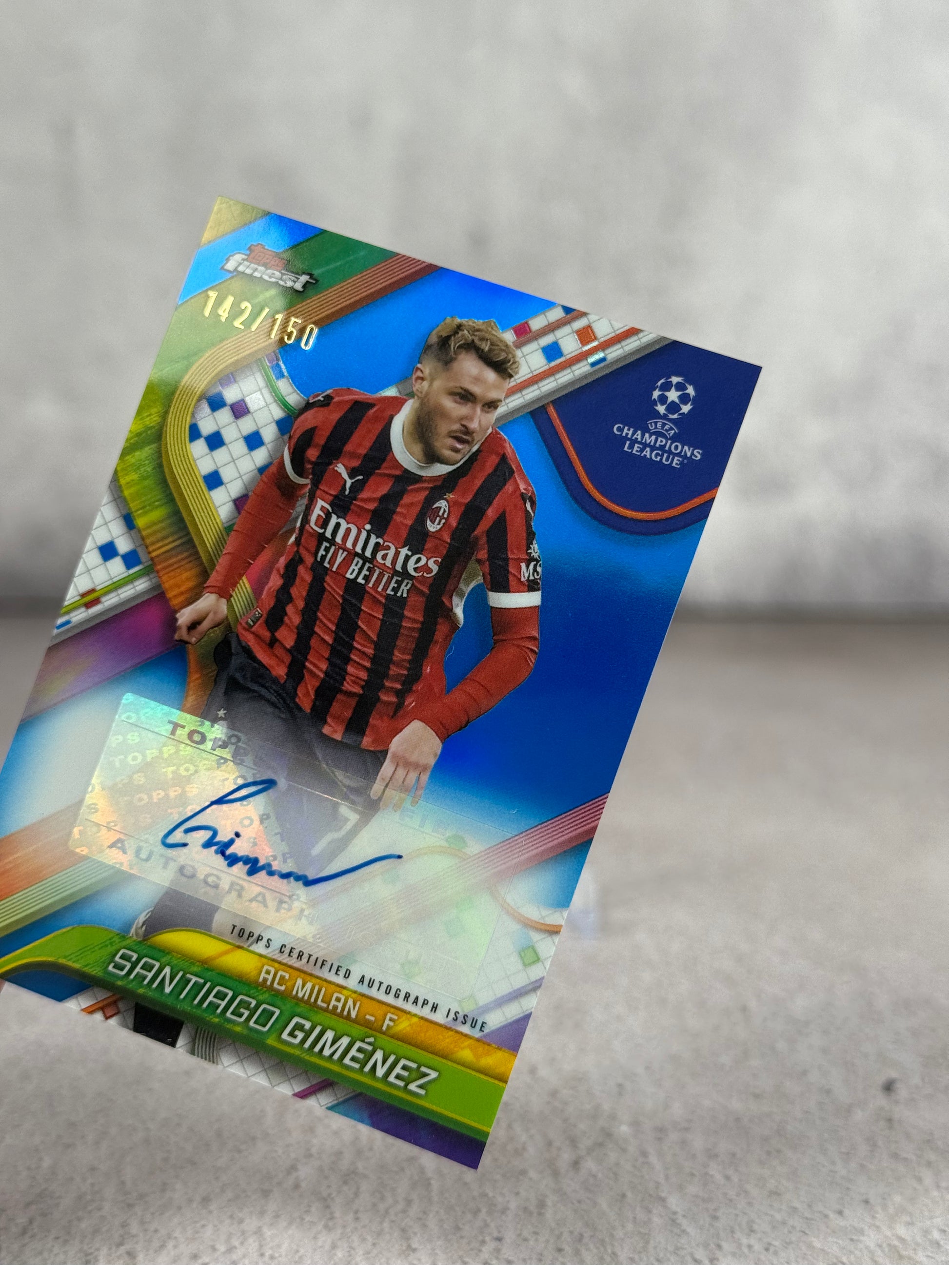 Tarjeta de Santiago Giménez con autógrafo, perteneciente a Topps Finest Champions League 2025, numerada 142/150, con referencia a AC Milan. Carta serializada de edición limitada con firma auténtica.